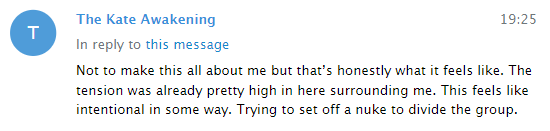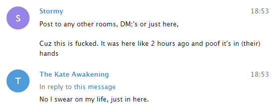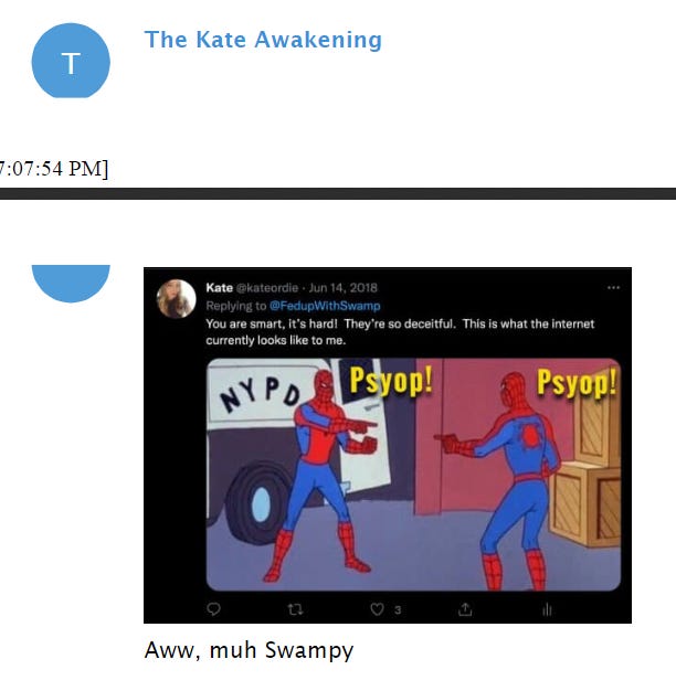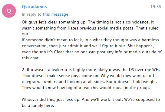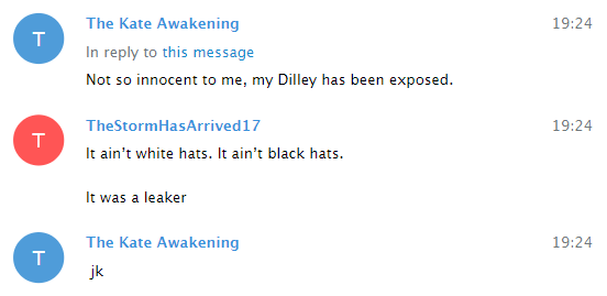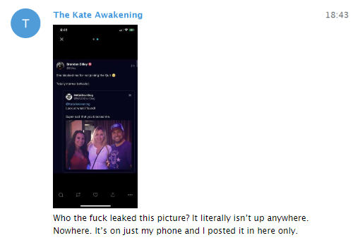 @stormypatriotjoe wonders if maybe @KateAwakening posted it to another private chat. Once again, she emphasizes that she didn't.