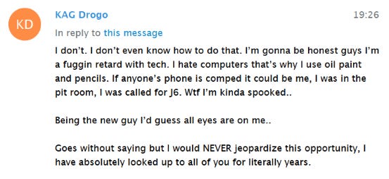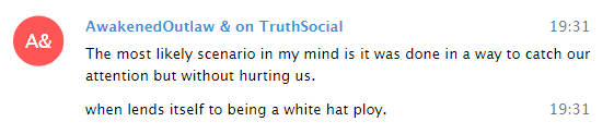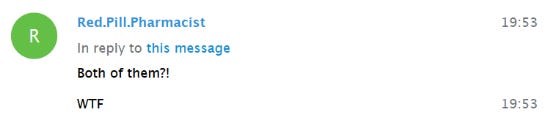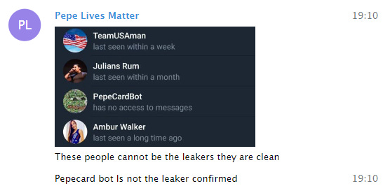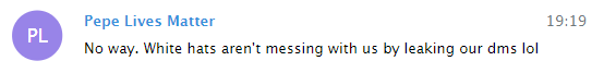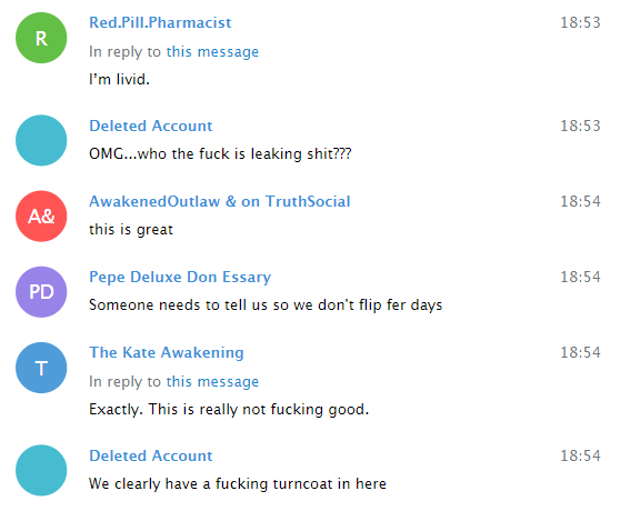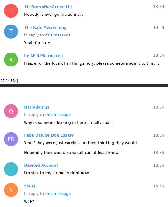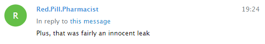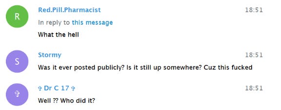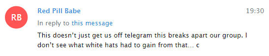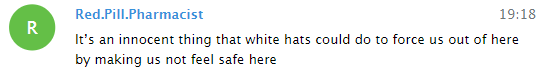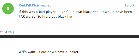 @RedPillPharmacist thinks that either white hats are trying to get them off TG to protect the group, or there's a leaker.