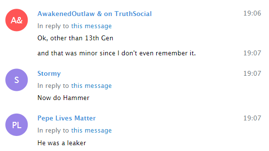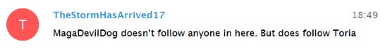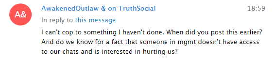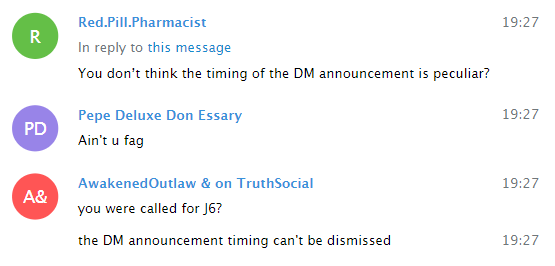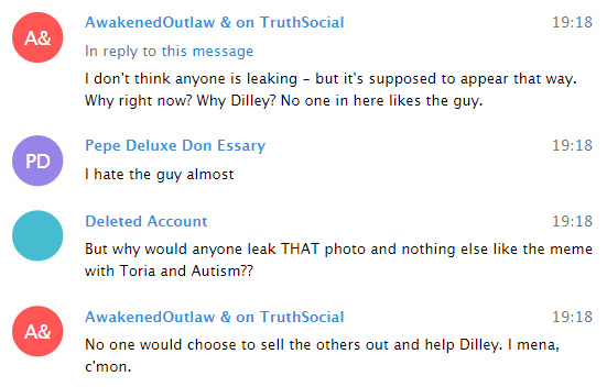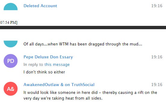 @RedPillPharmacist, @stormypatriotjoe, and especially @InevitableET, all get upset that someone is breaking the rule against leaking their private conversations.