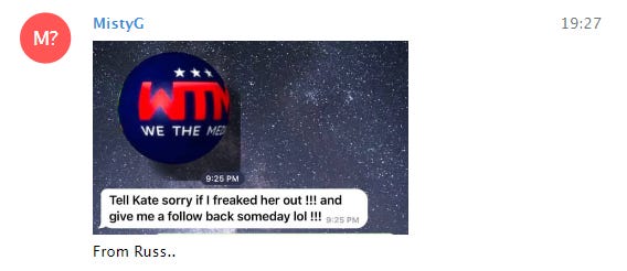 Earlier, @KateAwakening was asking who knew @RussAyers, who seems to have posted the photo before @MAGADevilDog? @MistyG17 knows him and contacts him. He replies.