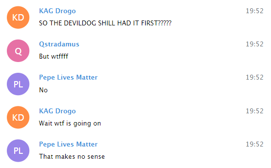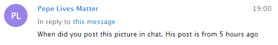 The photo was posted 5 hours earlier, so @PepeLivesMatter also wonders when @KateAwakening shared the photo to the chat.