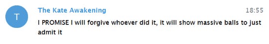 @KateAwakening promises to forgive the leaker, because it would take "massive balls" to admit to it.