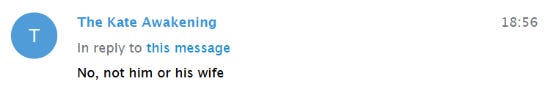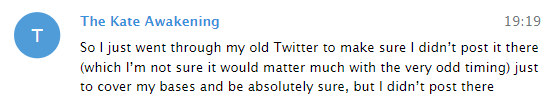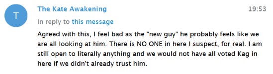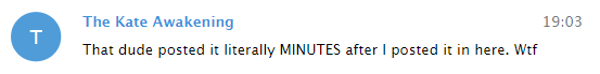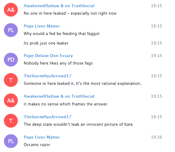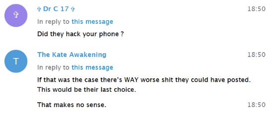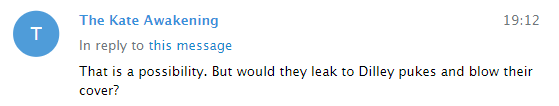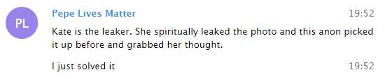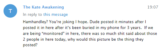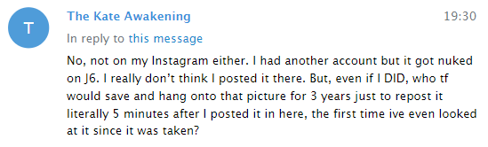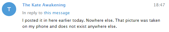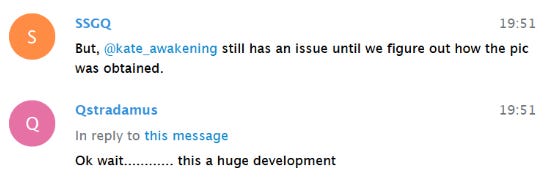 More of the profound trust they all had in Kate. They cannot conceive of a scenario where the photo was posted on TS first. That means it wasn't taken from the chat, not by white hats or black hats or a leaker.