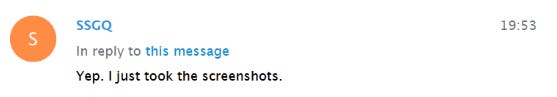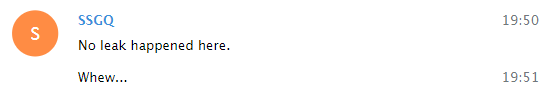 A minute goes by, and the chat is busily flying past without seeing what just happened, so @ssg_q has to call everyone's attention to the fact that he just disproved (and very easily) the leak story.