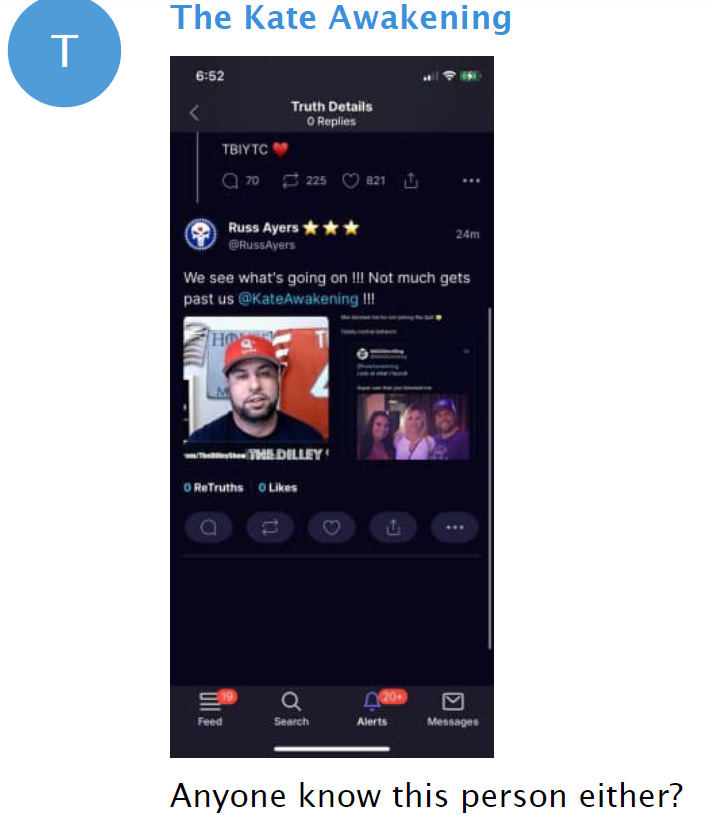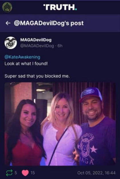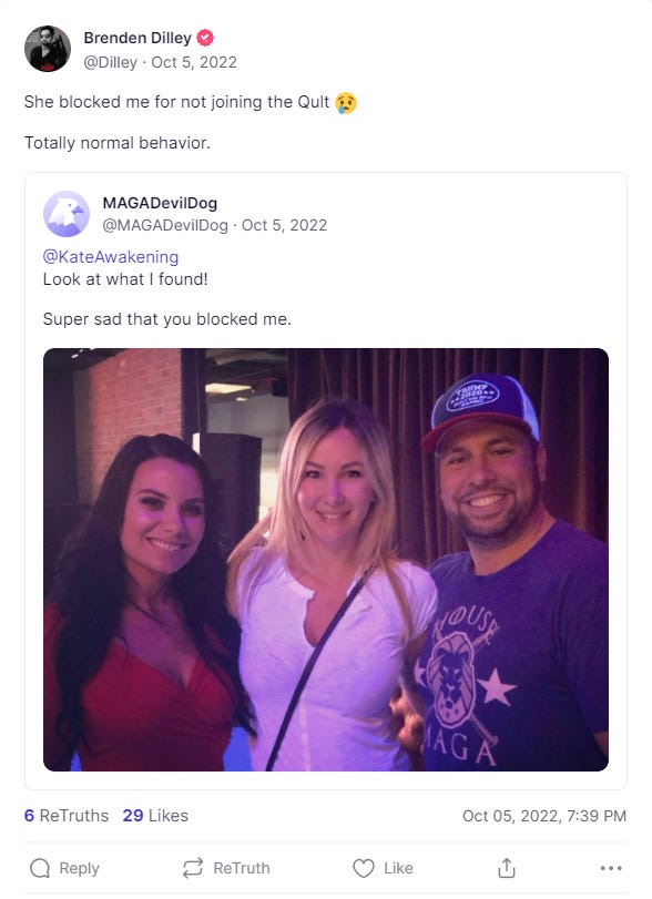 Kate posts a picture of a truth. Brendan Dilley, a popular guy on Truth Social, retruthed someone who posted a picture of Dilley, Kate, and a third person standing together smiling at the camera.