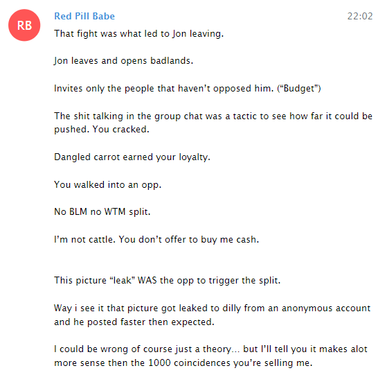 @redpillbabe considers it to be a turning point in the history of the group, and a key factor in splitting many of its members away to join Badlands Media. I'm very interested to read these logs for myself and see exactly what happened.