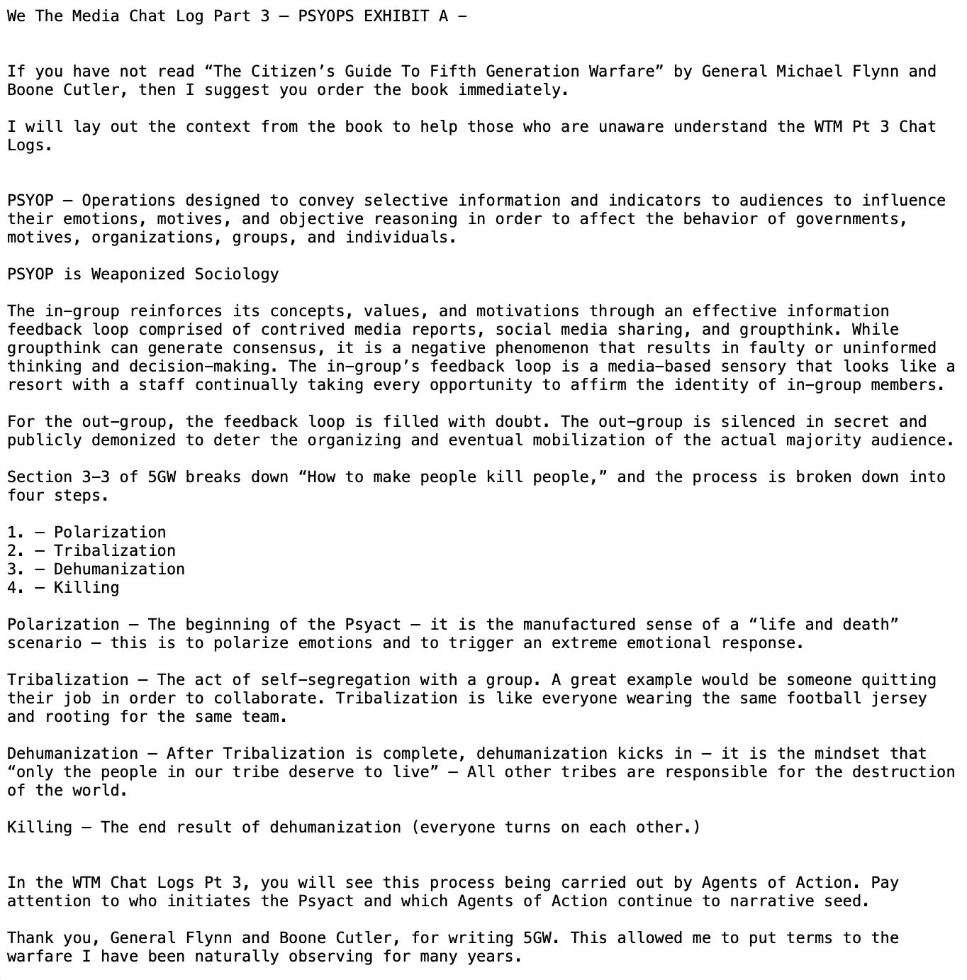 In the folder where @The_Authority drops the chat logs, he adds a preface, which lays out the basics of "How to Make People Kill People", a particular type of psyop which is excellent for dividing a group. Understanding the chat logs in the context of this information is key.