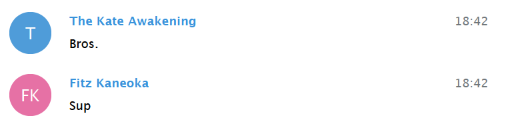 The incident begins on page 1 of the logs. Kate pops into the channel with an innocuous "Bros".