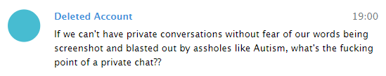 I wish I knew who Teal Circle was, but he or she is upset about the perceived privacy of the chat room being violated.