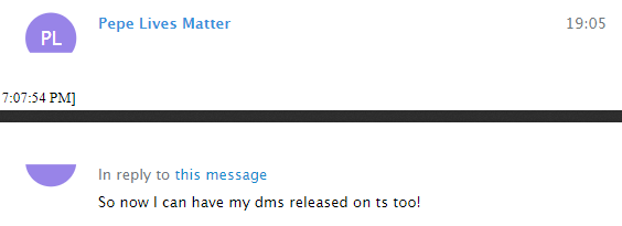@PepeLivesMatter says sarcastically, "So now I can have my dms released on ts too!"