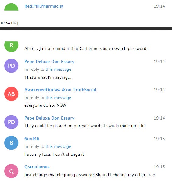@RedPillPharmacist points out that Catherine Engelbrecht asked everyone on Telegram to change their passwords in order to protect themselves.